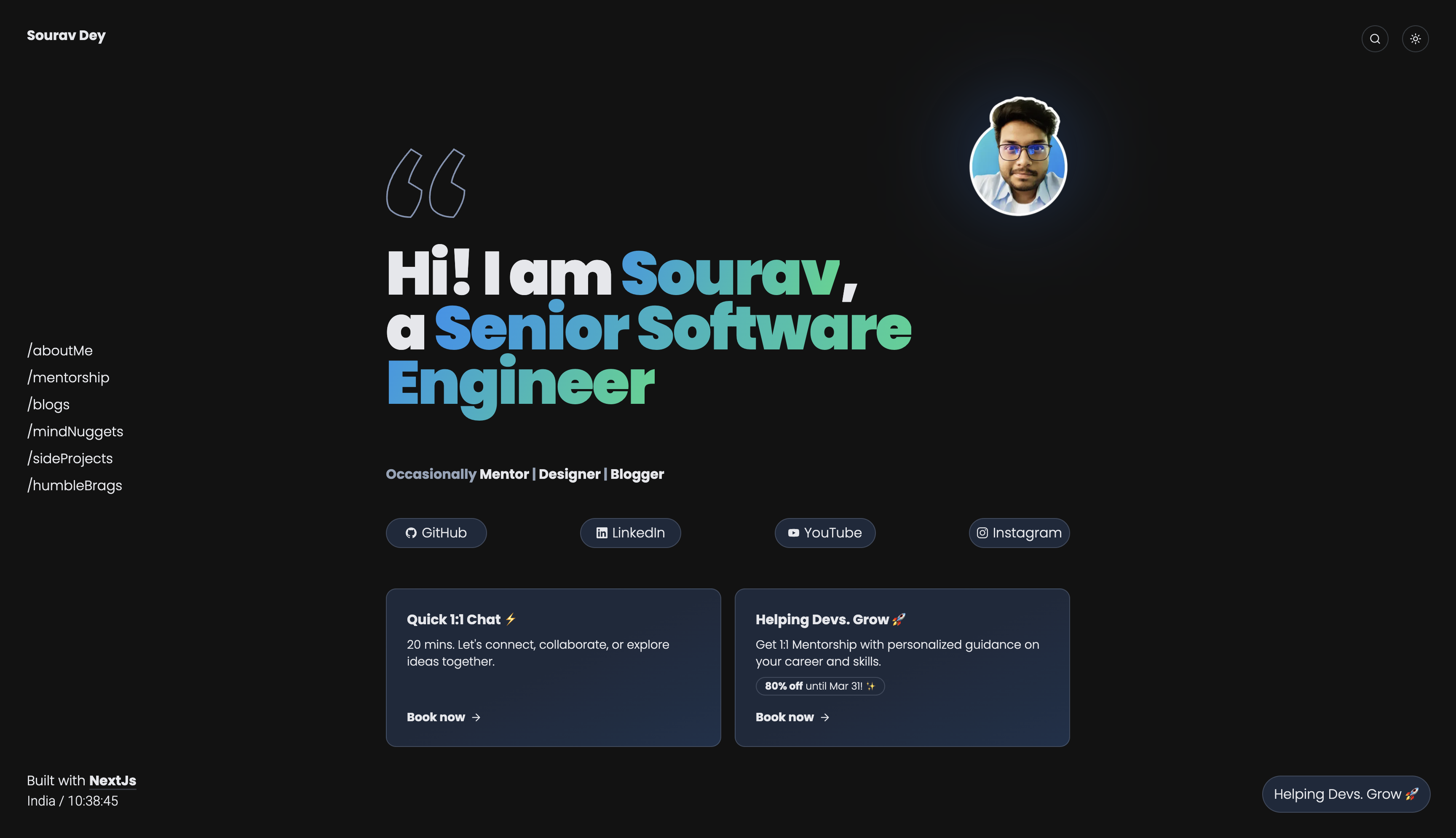 src/app/). Pages like /blogs, /blogs/[slug], /mindNuggets/[slug], /mentorship, and /sideProjects are first-class routes instead of sections inside a single view. That choice trades a bit of that original โone canvasโ vibe for something closer to how people actually share and return to specific pieces of content.๐ฆ Content lives in the repo, not only in APIs